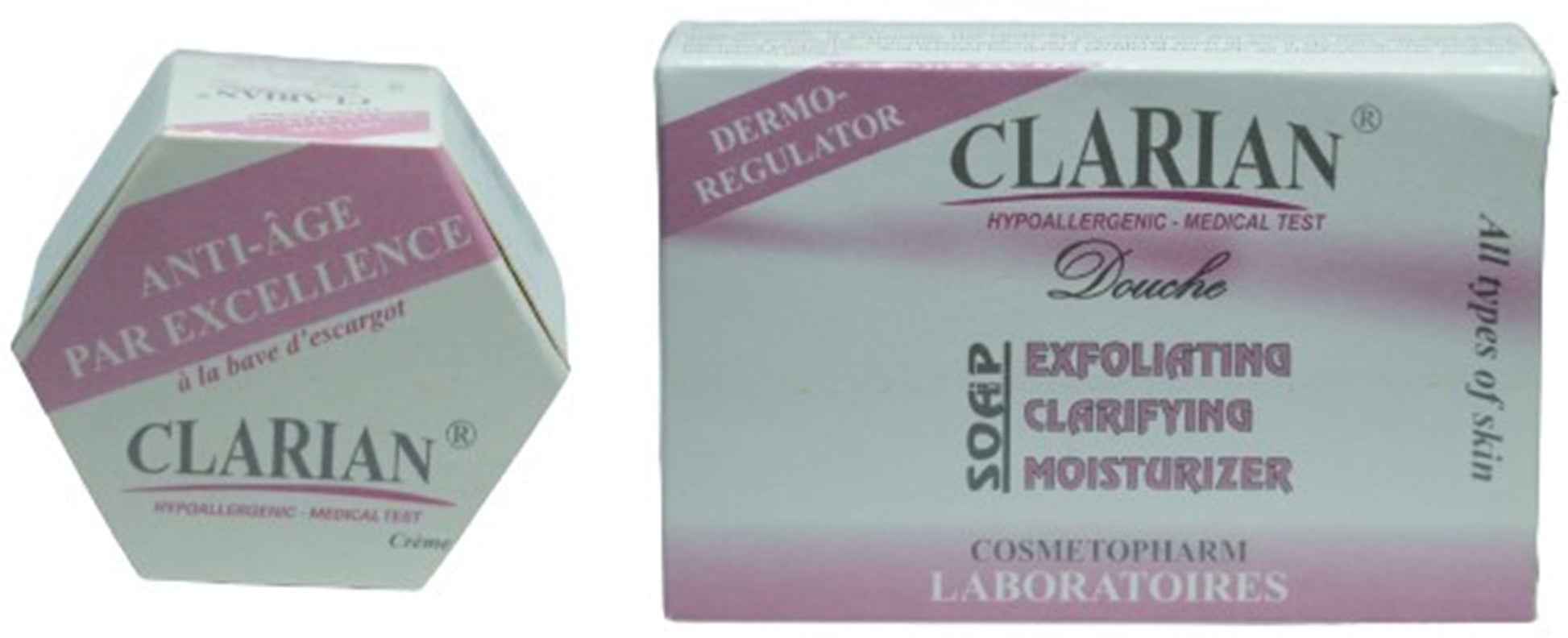 Carton de 100 produits contenant 50 Clarian crème et 50 Clarian savon.
